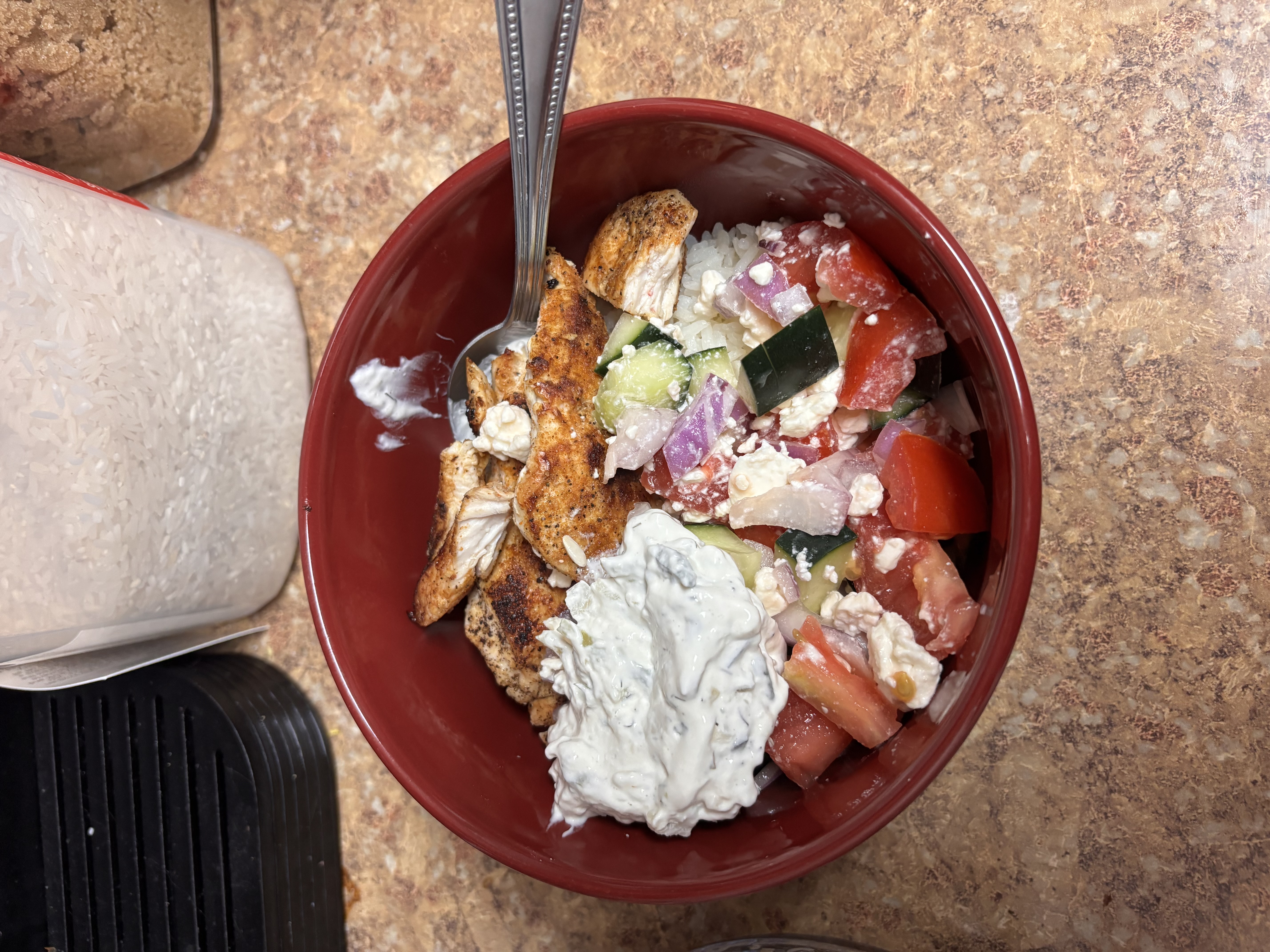 I'm not sure what recipe I used for this, if I'm honest, probably saw it on TikTok or some other platform like it. But anyway, it's basic. I tenderized, seasoned, and pan-fried my chicken breasts - 4 min on each side until cooked through. Then I cut it into strips diagonally. I think I used garlic powder, paprika, salt, and pepper for that. The base is just white rice and the veggies are diced up cucumber, bell pepper, red onions, roma tomatoes with feta. I put a dollop of aldi's tzatziki on it which I think REALLY overpowered the whole thing. It was wonderful and fresh and felt healthy but that was a bit much for my taste.